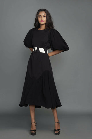Oversized maxi dress with georgette sleeves and bottom with contrast black and white belt