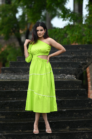 Carry this soft cotton maxi-dress for summer vacation look, go out for shopping or just wear it casually. This tier dress is elastic tube from one side and a bon-bon sleeve on other side. There's an elegant lace around each tear which gives a fancy look.