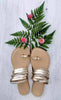 Add a metallic zing to your wardrobe with our best go-to-multi-strap flats, Purvai. She is a favourite pick amongst women from all walks of life and is handmade completely from pure leather right from her rustic and lustrous gold and silver straps to her comfortable leather base. An anti-slip sole is an added feature.