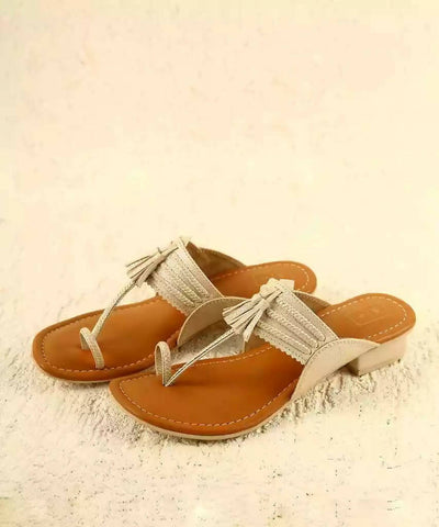 Our Champagne kohlapuri Small Heel Sandal, Raveena is handmade using a vegan leather upper and a tan leather base. A small tassel on the upper makes her very chic and unique. With a 1.5 inch heel, an anti slip sole and added cushioning, she is an ideal pick for parties or weddings.