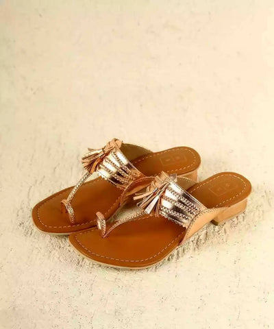 Our gorgeous hotseller, Sana is now available in a small 1.5 inch heel. Handmade using a rose gold metallic leather upper with a tassel and a tan leather base, Sana is an elegant pick for parties or weddings. Added cushioning & an anti-slip sole make her the perfect pair to dance all night in!