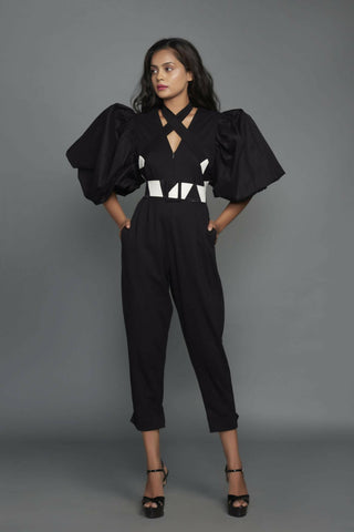 Jumpsuit with cross body belt. Comes with cotton oversized sleeves. Comes with cross body belt