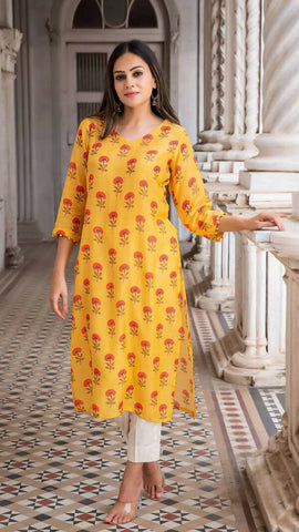 Comfortable kurta made in soft cotton silk. Features a V neck and quarter sleeves with potlis.