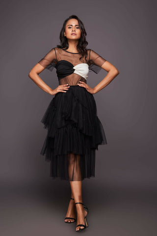 3PC NET RUFFLED DRESS WITH A BUSTIER AND INNER SKIRT
