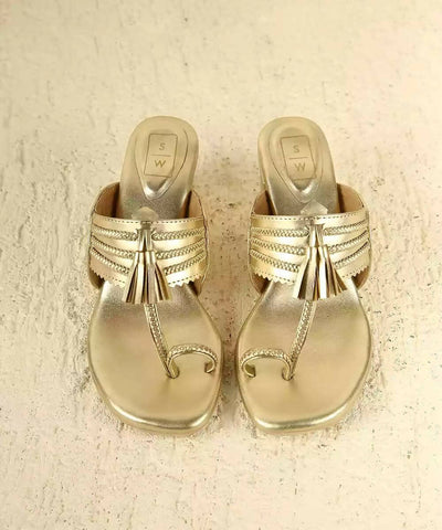 Our Shaadi special, Alia Block Kohlapuri Heel is handmade of vegan leather. She has a metallic gold vegan leather upper with a tassel and a comfortable 3 inch heel. Added cushioning & an anti-slip sole are additional features. This pair is ideal for any formal occasions - from weddings to parties.