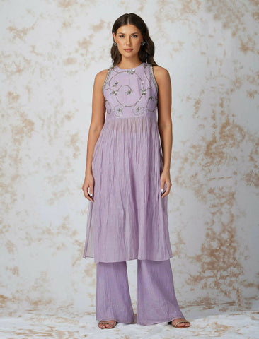 This high slit gathered tunic features an antique sequin work yoke with in cut shoulders. it is paired with elasticated waist flared pants, highlighted with sequins.