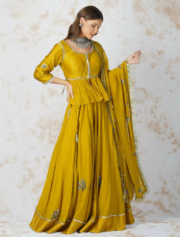 Beautifully hand embroidered with antique sequins, this lehenga is paired with a front open cupped blouse and a georgette dupatta finished with fringes.