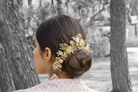 Featuring a Gold and Silver wedding party wear wreath Hair Comb with sequins, crystals, pearls and beads floral motif embellishment.