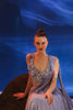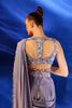 A deep V neck wrap around blouse paired with a full flare pleated drape saree is the perfect ensemble to make a statement. The Asherah drape is a heather purple hued saree that is as graceful as it is exclusive.
