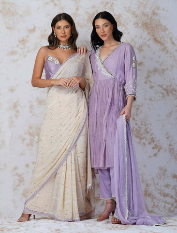 Wrap style side tie-up kurta with bead and crystal work. it is paired with sequin highlighted dupatta and elasticated waist glace cotton pants.