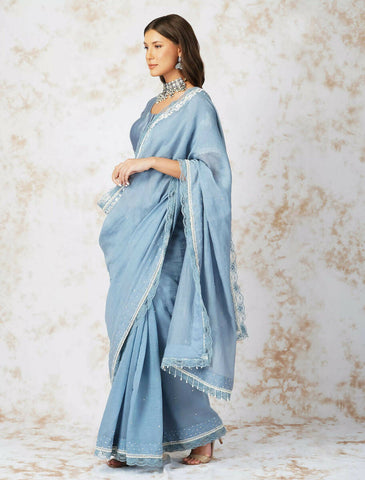 Chanderi saree embellished with beadwork and crystals is detailed with laces. it comes with a sequin highlighted unstitched blouse piece.