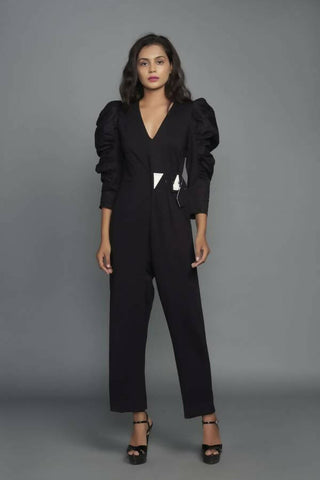 V neck overlap jumpsuit with oversized puffed sleeves and attached black and white belt.