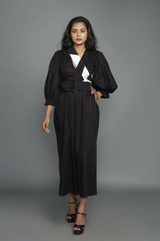 Cotton V neck jumpsuit with puffed sleeves.