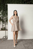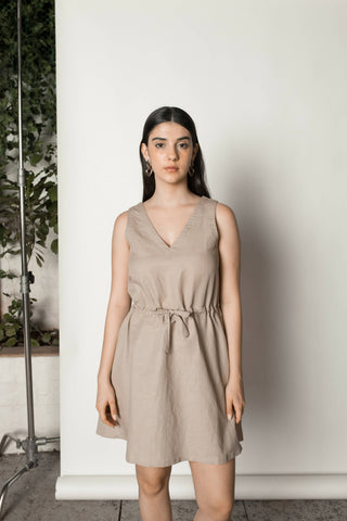 Description: This mini hemline is a key cut for your playful mood. This dress is enhanced by the drawstring detail at the bodice which flares our to an A-line skirt. Design details include the front and back V-neck, side seam pockets and sleeveless silhouette that allows for layering.