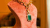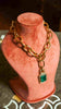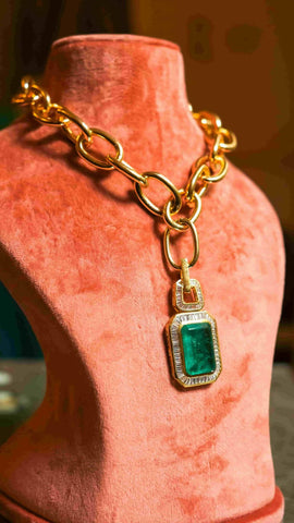 This sophisticated design boasts chain strung together in several rows and from the bottom row hangs with emerald stone. The classic design is a great accessory to invest in.