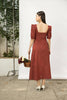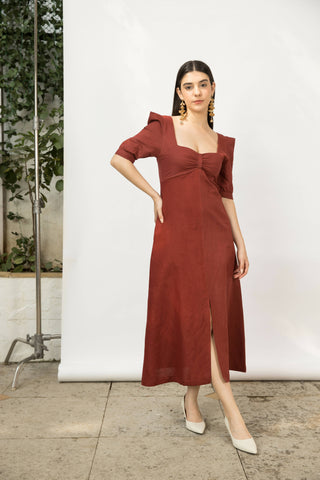 Description: This season heralds the return of romantic silhouettes as this front slit dress. It is cut to a midi length and has a sweetheart neckline. The sleeves are lightly structured and are elasticated for a good fit. The sexy silhouette is completed with a front centre slit.