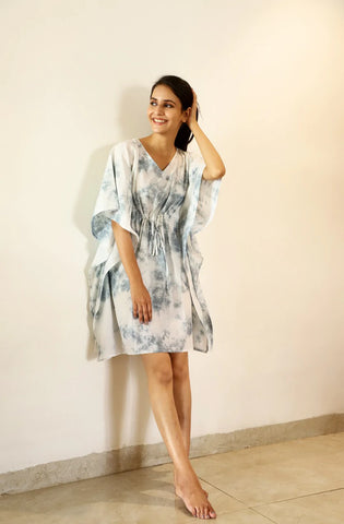 A gorgeous short Tie dye kaftan dyed in softest cotton that will glide on your body. Wear as a dress or team it up with palazzos or crop pants. This kaftan promises to be your best friend on a tropical vacation or while lounging at home.