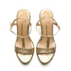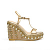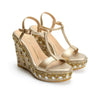 Featuring a pair of gold kolhapuri wedges in faux leather base with heavy embroidery. It has a faux leather underlining, gel cushioning, and 5 inch heels.