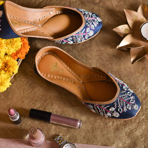 The colour blue transcends you into a world of calmness and glamour at the same time. The elegant motifs on this jutti represent a plant with buds and shoots with leaves which looks serene but instilsa sense of vigour among women. The elegant design also exudes an energy that gels with the indigo blue fabric. While the design is bright, it can readily showcase your spirituality while considering the traditional appeal. As the namesuggests, you look radiant and have a unique shine wherever you go.