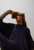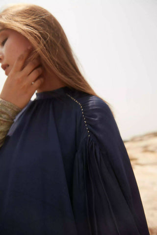 Interesting combination of Metallic Fit Sleeves and Midnight Blue Body. The evening look is elevated with dainty embroidery on the shoulder joint.