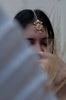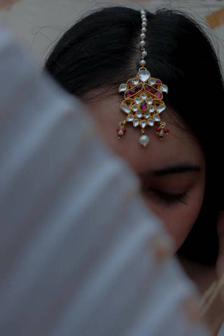 The Nazm maangtikka ticks every box for being the absolute stunner of an Indian jewel. The design features a beautiful traditional Indian jewelry inspired design with ritualistic colors. The pearls at the bottom add beautiful movement to the design.