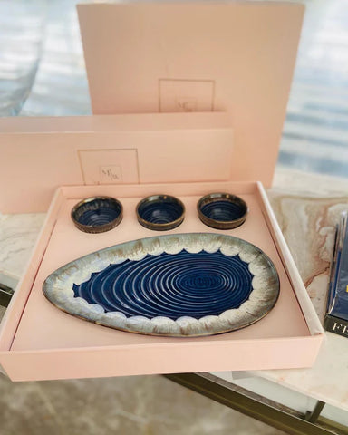 An oval platter gift set in a beautiful shade of blue, perfect for presenting your culinary creations in style. The set includes an oval platter and coordinating dipping bowl, making it an excellent gift for a host or hostess. The elegant design and durable construction of this platter set make it a versatile addition to any kitchen or dining room.
