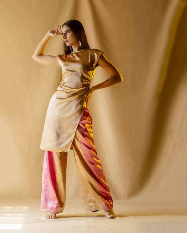 The Peony pants are the IT color-block flared pants with a wavy cut flared hem accentuated with a golden lace. It comes with a front zip and button closure.