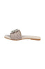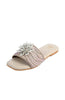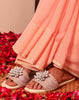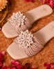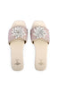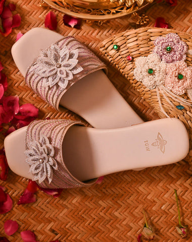 Crafted on an ivory silk base, these Slides glisten with a silver sheen. Lavender cutdana sewn in a wavy pattern with silver shimmer dori on the base, and a 3D multi-petaled flower with a lavender crystal at its centre makes it one of the most beautiful pair in the collection. With ‘Rabia,’ your feet become a blooming paradise, a perfect choice for adding elegance to any occasion. All our Slides are VEGAN – made in premium faux leather and super comfortable for wide feet! And double cushioned for that extra comfort.