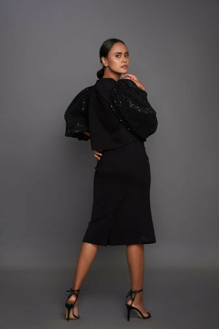 Co-ord set of midi skirt that is paired with a short top with oversized sequence sleeves