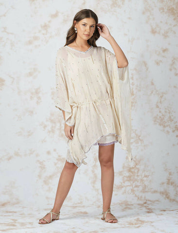 Sequined kaftan with a separate dori belt is paired with shorts and comes with a rayon slip.