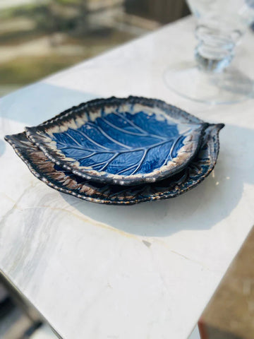 A set of 2 leaf platters typically includes two platters that are designed to resemble leaves, often in a similar shape and texture to real leaves. They are made of materials ceramic and are used for serving food or as decorative pieces in home decor. The platters can come in different sizes, with the smaller one being suitable for snacks or appetizers , while the larger one can be used for serving main courses.