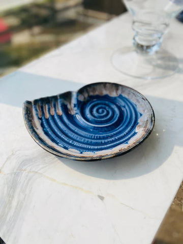 A shell platter in blue is a decorative platter or tray that is shaped like a seashell and features a blue color scheme. It are made from material ceramic and is often used as a serving dish or as a decorative item in beach-themed or coastal-inspired decor. A blue shell platter can be a unique and stylish addition to any home or event decor.
