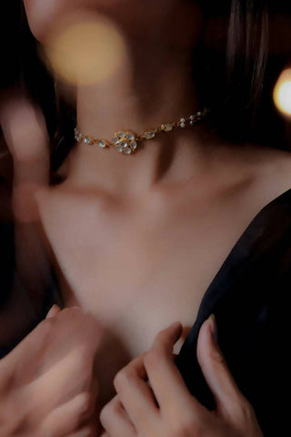This dainty necklace features a floral design encrusted with kundan. This very versatile design can be a great accessory for everyday wear.